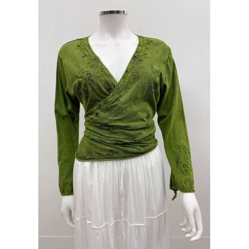 Acid wash tie/wrap top with embroidery.