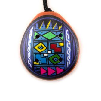 These beautiful ocarinas are a minature version of our very popular  inca ocarina. Made from fired clay in Peru and carefully decorated with colourful traditional designs, these tiny instruments have been strung on a handy cord necklace to take with you wherever you go.