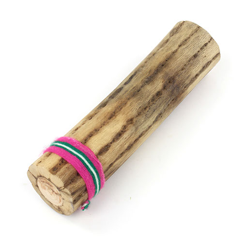 This attractive rainstick is made from a length of naturally fallen cactus. The spines are pushed back through the hardened skin, into the hollow body of the instrument. This is filled with tiny gravel and the ends are then sealed.